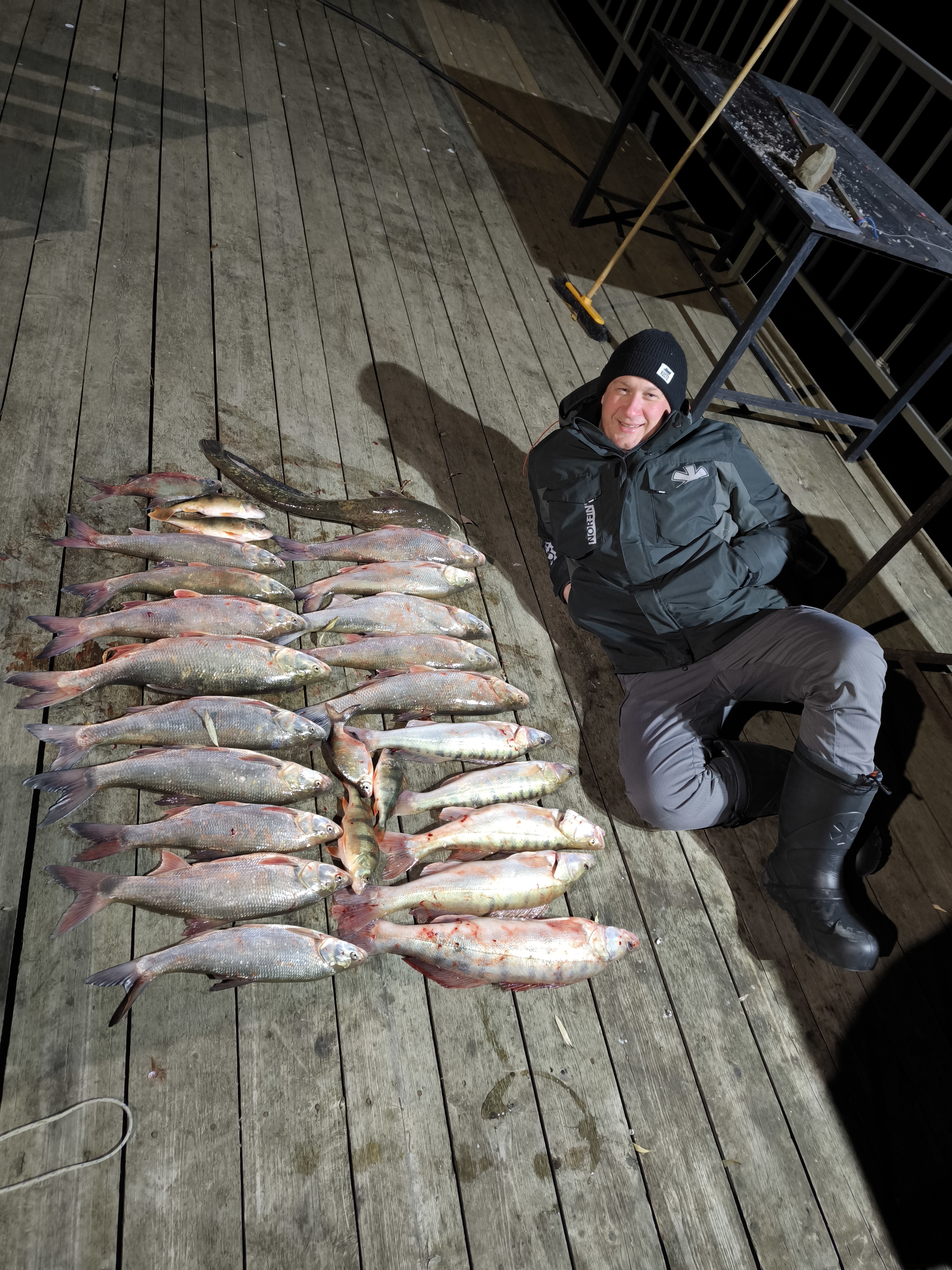 Переходный период рыбалки с осени на зиму. Судак — джигование, оснастка мандула, вес груза нужно подбирать, цвет мандулы желто-белый-зеленый. Жереха ловили на воблер с заглублением 1,5 м, типа Малас, цвет сине-желтоядовитый. Толстолобик багрится при джиговании, как обычно.